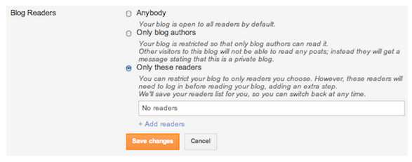 Debajo del título Lectores del blog, probablemente esté seleccionada la opción "Cualquiera" de forma predeterminada. Al cambiar la selección a "Solo estos lectores", tendrás la opción de añadir lectores.
